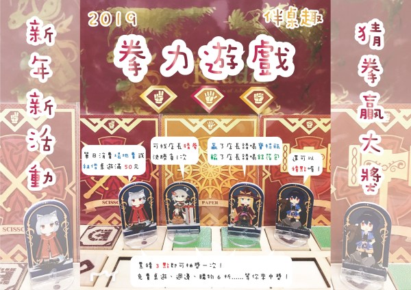 2019年開始就是要來個有趣的新活動阿! 即日起,來伴桌趣玩桌遊/租借桌遊/買遊戲, 都可以玩一次拳力遊戲!!... Continue Reading →